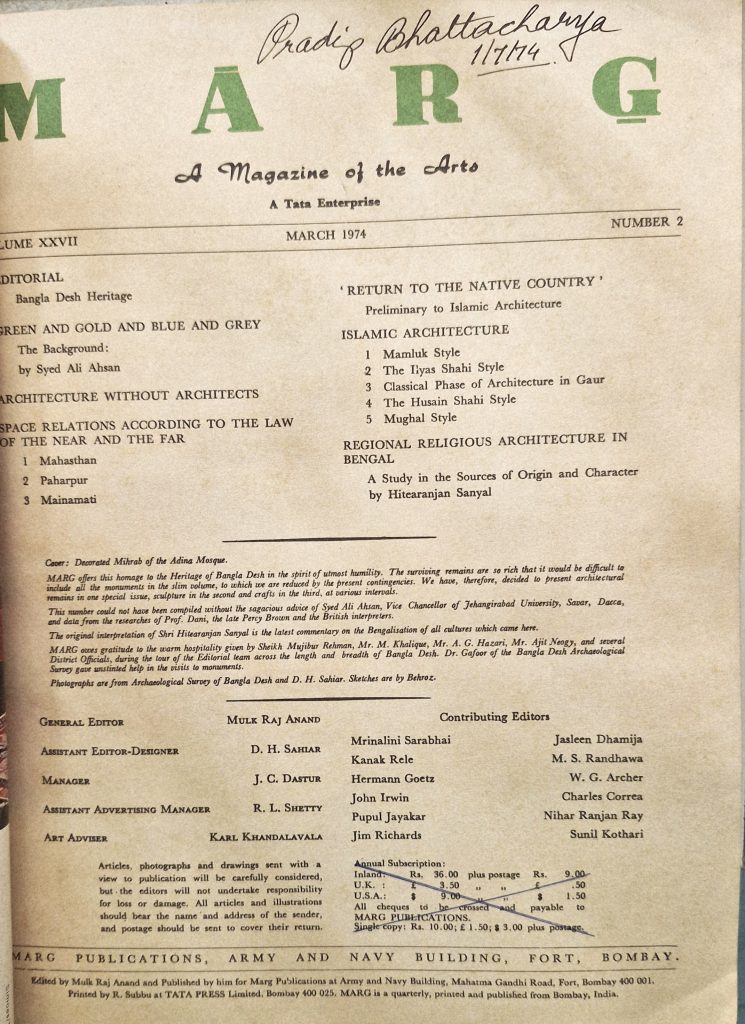 On the evening of 14 April 1972 I met the renowned novelist Dr. Mulk Raj Anand in the bungalow of the District Magistrate, Malda, Mr. S.P. De IAS (1959 batch). I was then Assistant Magistrate and Assistant Collector on training. Anand was accompanied by Miss Dolly Sahiyar, photographer of MARG magazine and Sri Ajit Neogi, President Bangla Academy of Rajshahi. MARG was publishing a feature on Muslim architecture of Bangladesh. I was asked to guide them around the historical monuments.